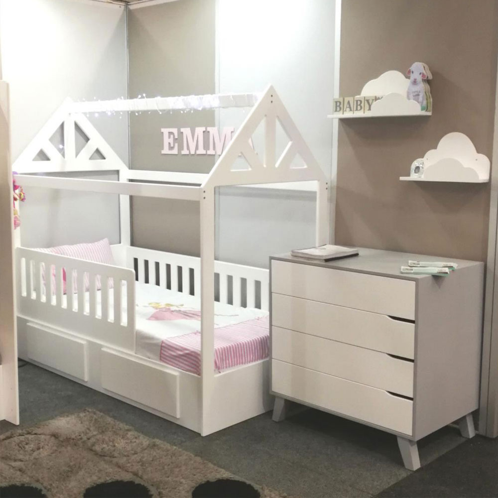 With a modern design with a charming unique truss design on the roof, complete with guardrails, parents can have peace of mind knowing their little one is safe and secure during sleep and play. The bed features built-in drawers that provide added space for toys, books, or bedding. Strong and durable bed manufactured in pine and supawood combination. Guardrails are removable when no longer needed.