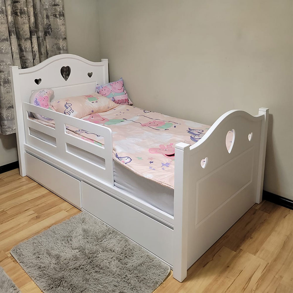 design cutout. For added functionality optional storage drawers can be incorporated providing storage for toys and shoes. Guardrails can be added on for toddlers, which are removable when not needed.