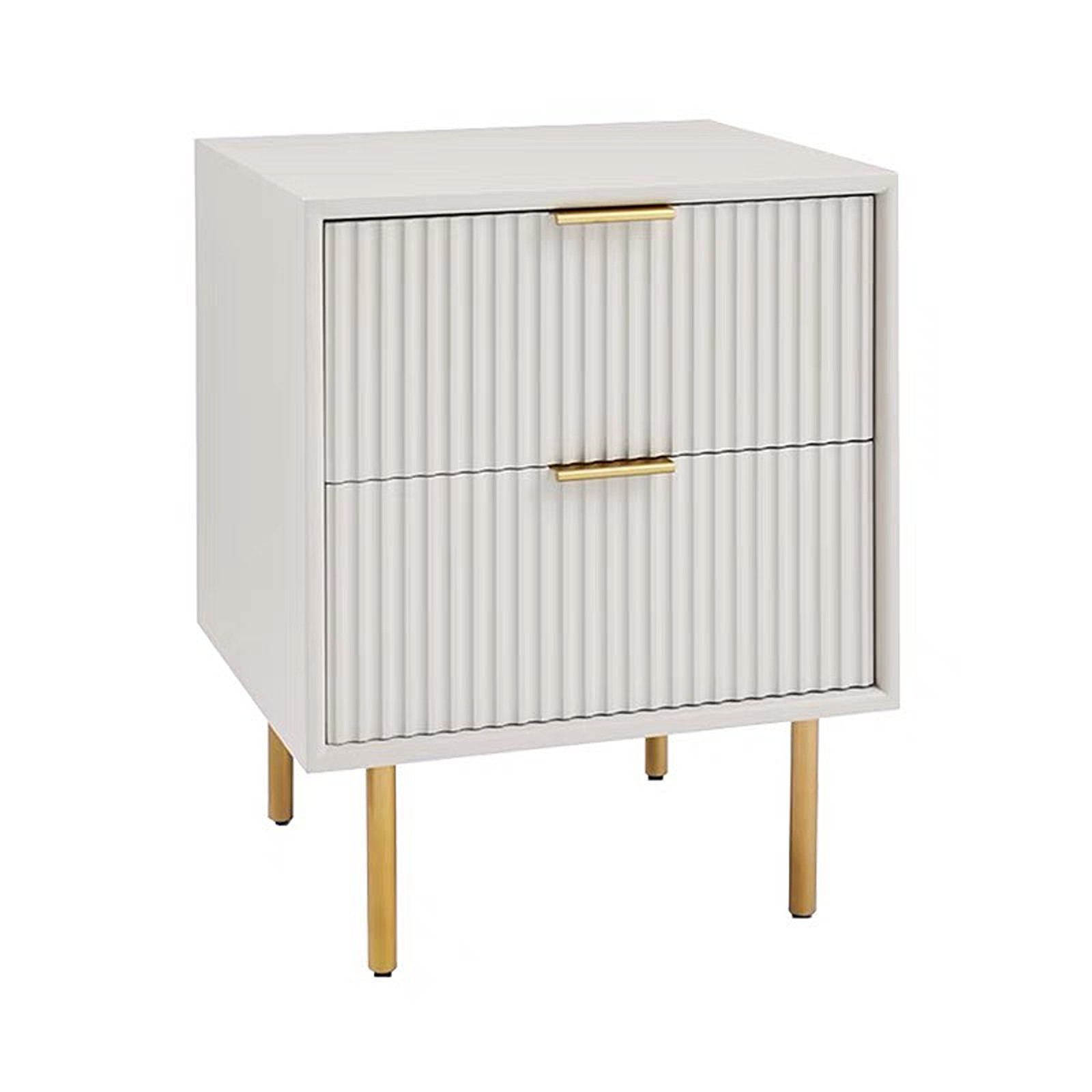 The pedestal 2-drawer with gold legs and handles and fluted drawer fronts is a stunning piece of furniture that combines modern design with luxurious details.