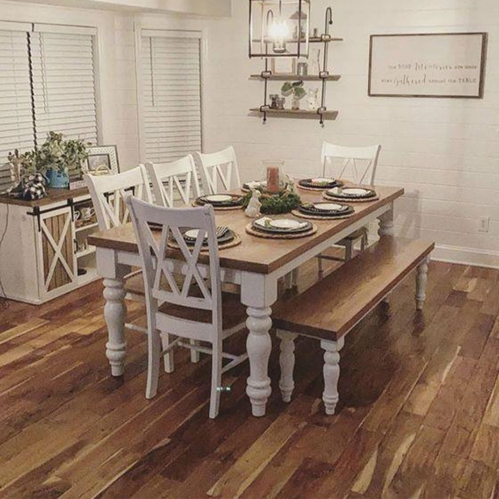 A cottage dining room with white chairs and a wooden trestle table, a glam chandelier to add style to the space