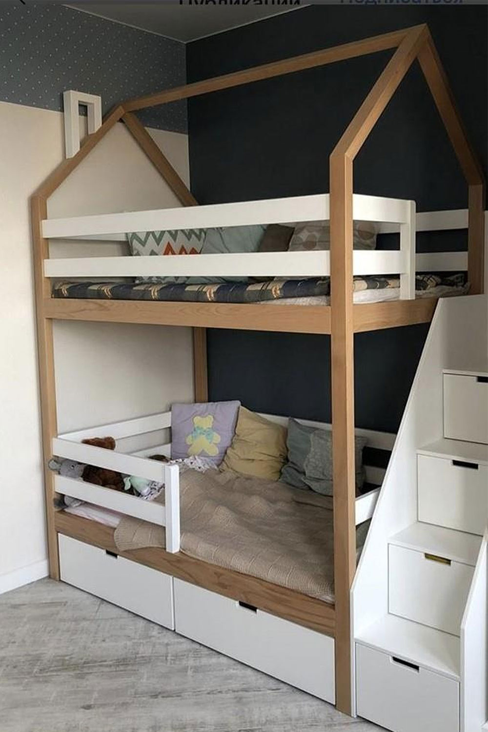 At the peak of the bunk bed house design sits a whimsical chimney adding a touch of rustic charm. The bottom bed has two storage drawers and a guardrail for a safe sleeping experience for our little ones,