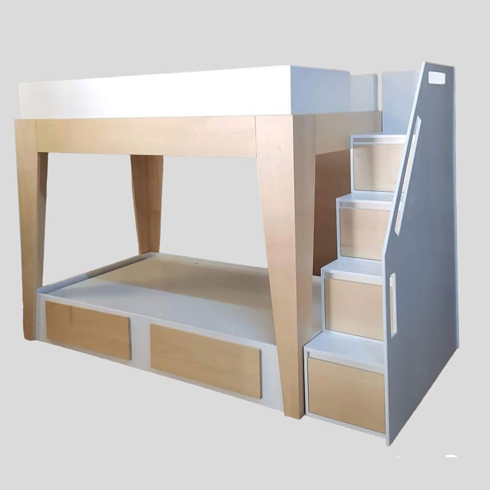2 x single bed combination manufactured in solid beech natural wood and supawood combination, featuring a staircase with 4 storage drawers and additionally two storage drawers on the bottom bed. The sleek wooden beech slanted legs not only add stability but also contribute to the overall sophisticated look.
