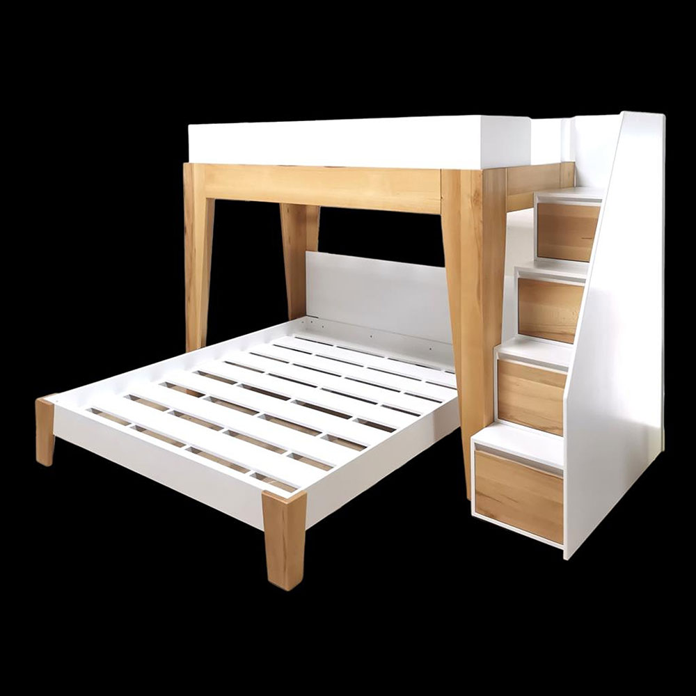 Introducing our sleek and contemporary oak and white combination Bunk Bed, designed to elevate modern bedroom space. The design stands out with its unique slanted oak legs and oak bedframe for the top single bed, the bottom bed is double size bed positioned in a L shape position. Additionally the staircase has 4 storage drawers providing ample storage.