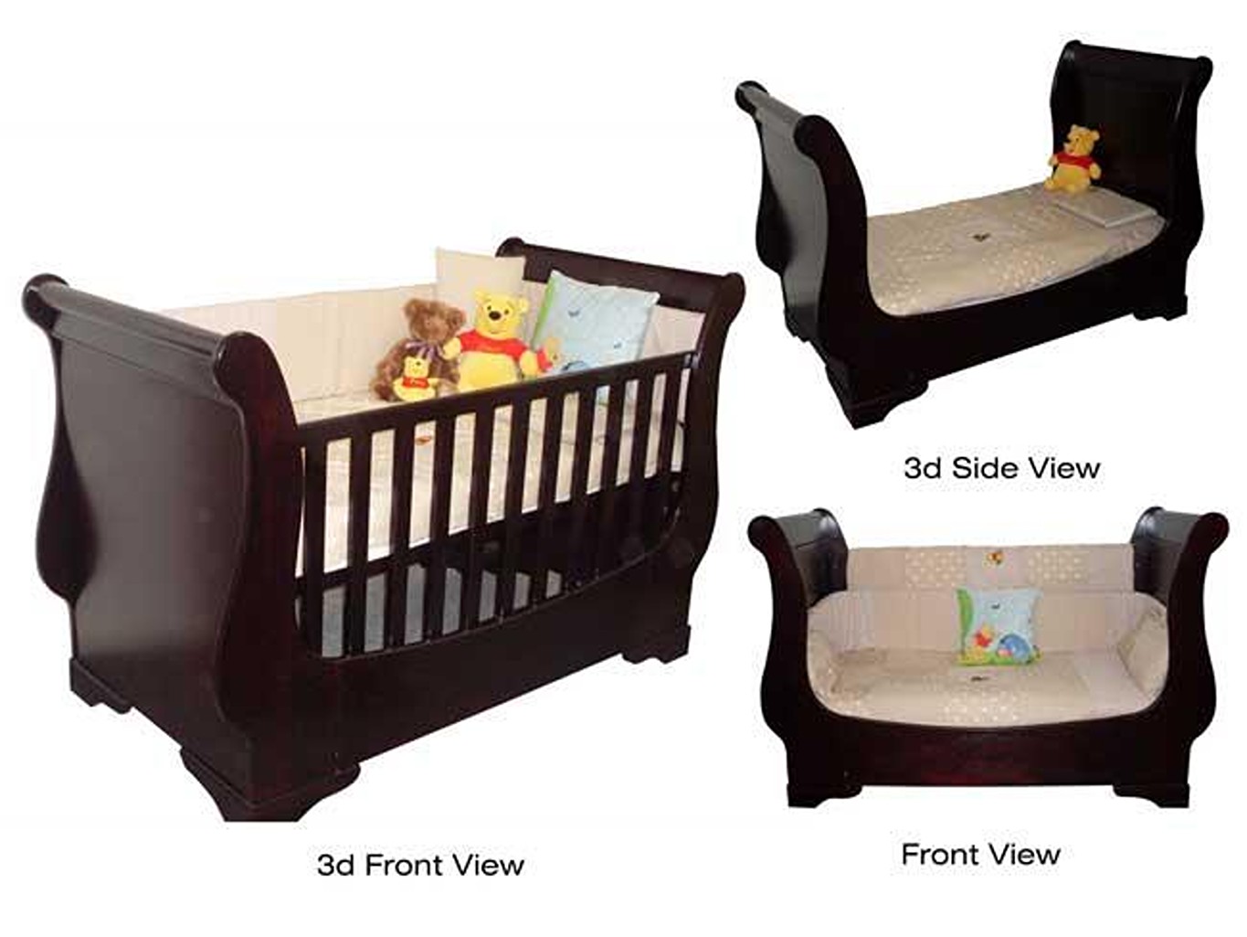 The Large 3 in 1 sleigh cot has two adjustable levels. Large cot the converts into a toddler bed and eventually becomes a couch. Takes a mattress size 1300mm x 660mm.