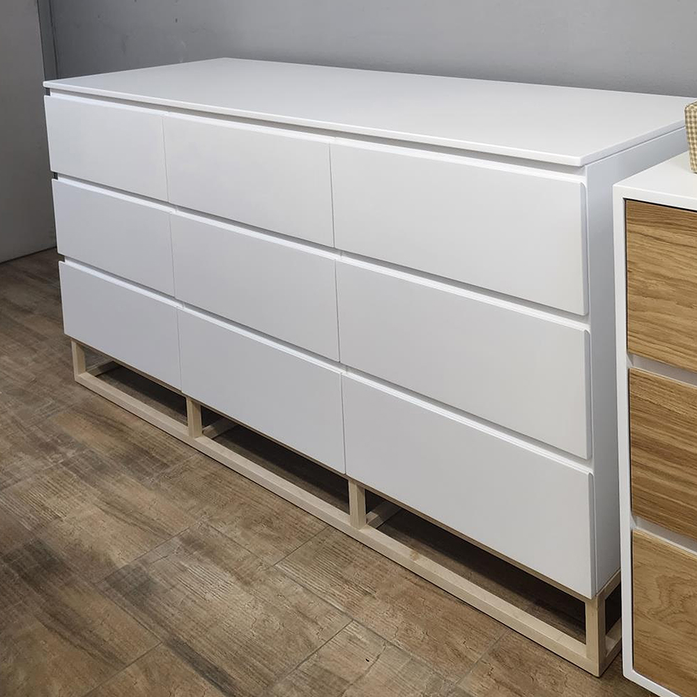 With 9 spacious drawers, this compactum offers ample storage for all your essentials. The contrasted wooden base not only enhances its aesthetic appeal but also provides a strong and sturdy support.