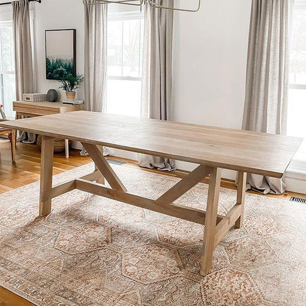 This warm and inviting dining table is crafted from solid wood with a natural finish. The table features a trestle base with clean lines and a modern silhouette. It is perfect for creating a cozy and stylish dining space in your home.