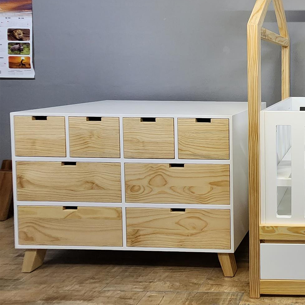 The compactum boasts 8 spacious drawers for all your baby’s essentials. Additionally, the compactum has four smaller drawers on top, offers convenient organization for smaller items, ensuring everything has its place in your little ones Manufactured in supawood and in natural wood pine.