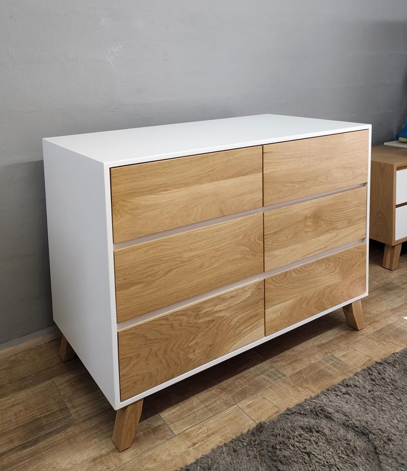 The 6 drawer compactum features sleek wood drawer fronts and legs, elegantly contrasting with its