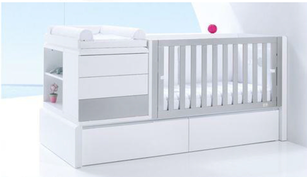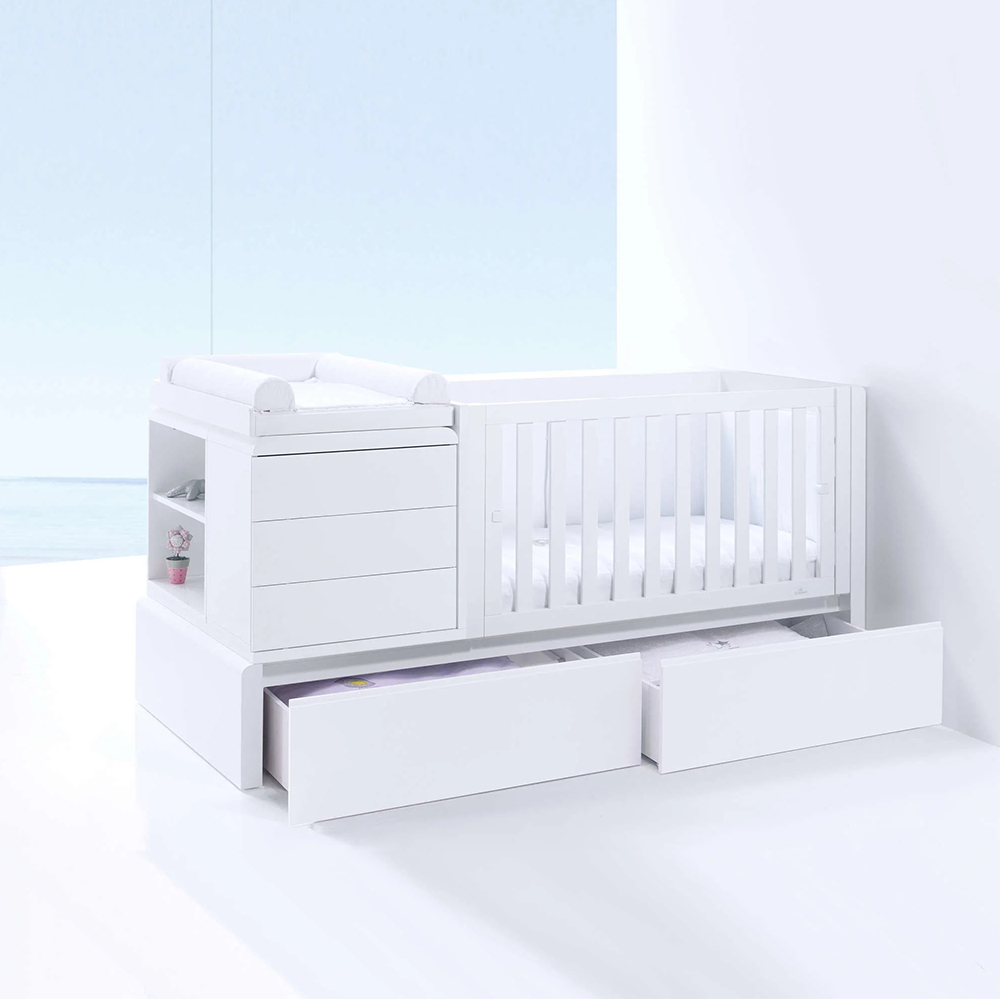 The cot that transforms into a complete mini bedroom suite. Starts out as a cot with adjustable levels, then converts into a single bed With 2 storage drawers, 2 pedestals and a mini chest of drawers. A cot that grows with your baby, a perfect solution for a complete junior bedroom.