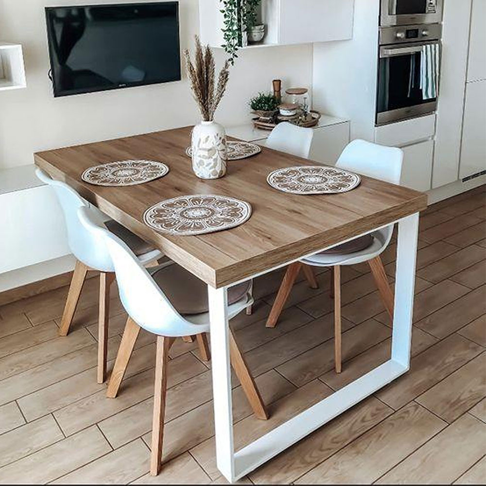 This unique kitchen table combines rustic charm with modern industrial style. The table features a rough-hewn wooden top with a natural finish, supported by a black metal base. The simple design is perfect for any kitchen or dining room.