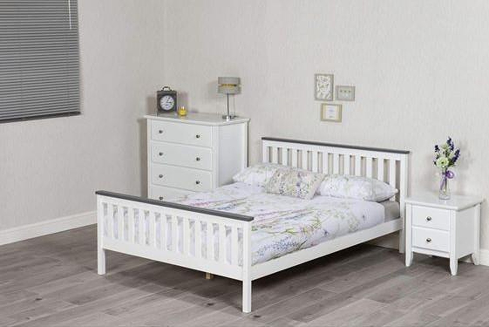 This bed has a sleek slatted design that adds visual interest and texture to any space. Featuring a striking combination of grey and white hues. Can be done in all different bed sizes, please make enquiries.