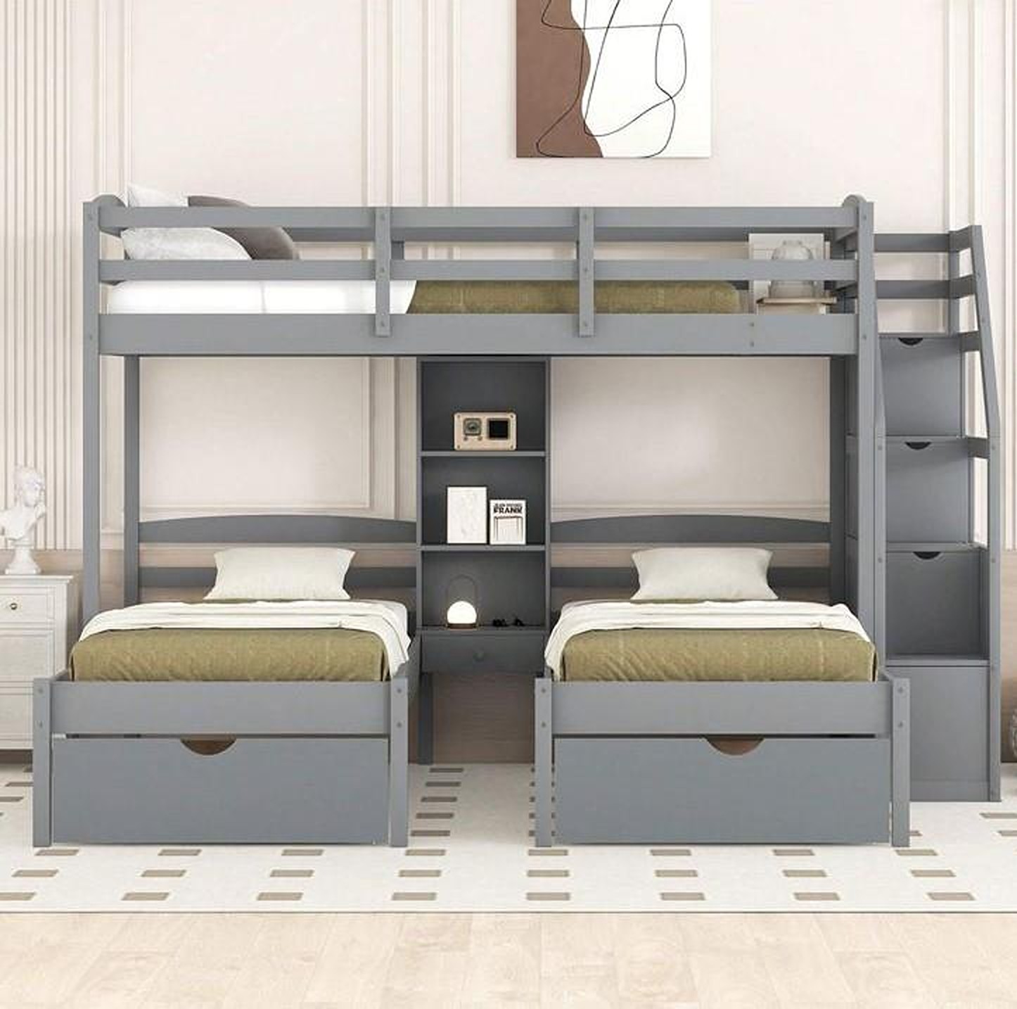 Introducing the ultimate space-saving solution, the Triple Sleeper Bunk Bed. This innovative design features a single bed on top and two single beds at the bottom arranged in an L-shaped configuration to