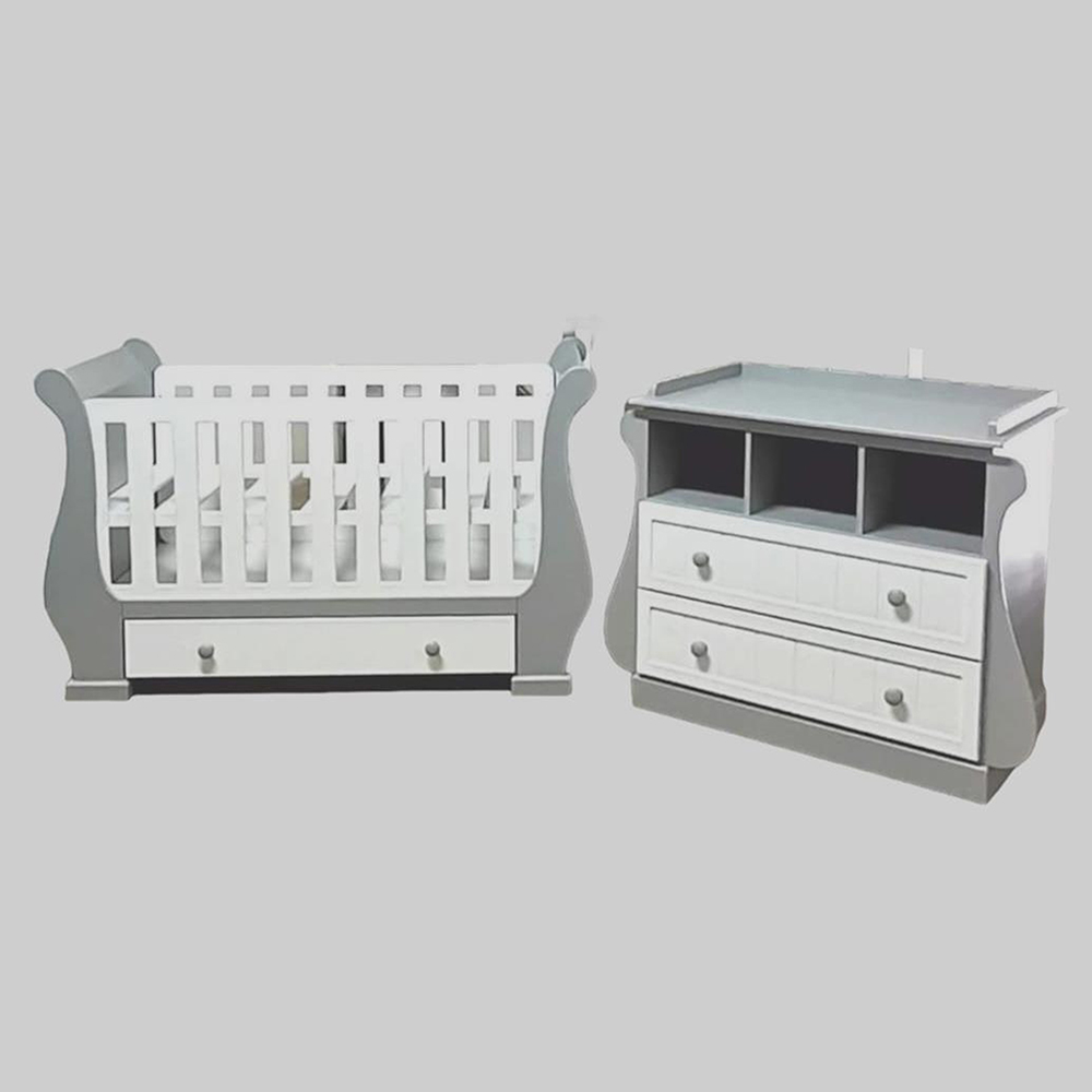 This grey and white sleigh cot and compactum sets blends classic elegance with modern functionality. The cot converts to a toddler bed and couch eventually, it features a built-in drawer for