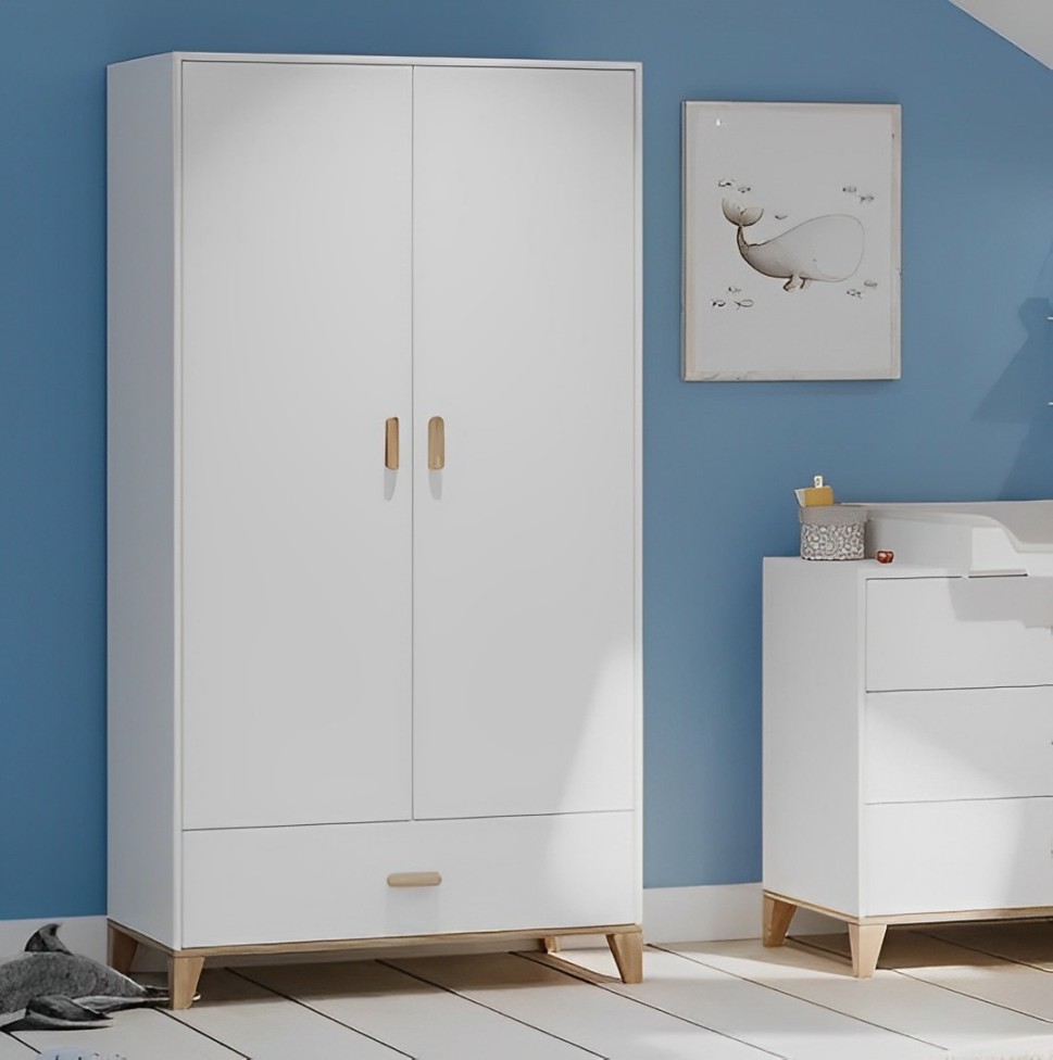 A modern design that meets rustic charm. Crafted with sturdy wooden legs and complemented by wooden handles. Double hanging rails inside for tiny garments, with shelving and a drawer. Manufactured in supawood and natural wood oak,