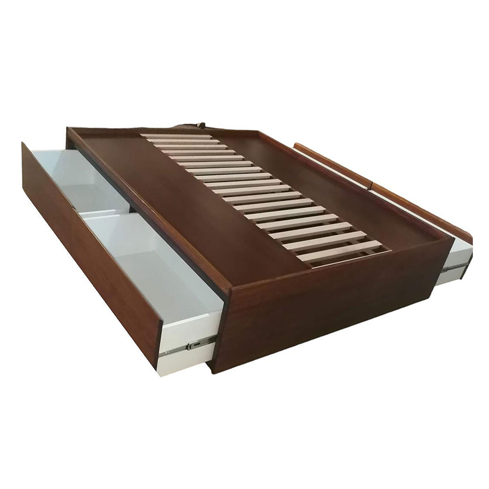 A wooden base for a bed with storage drawers typically consists of a sturdy wooden base designed to support a mattress, with built in drawers underneath for storage, providing convenient space to store